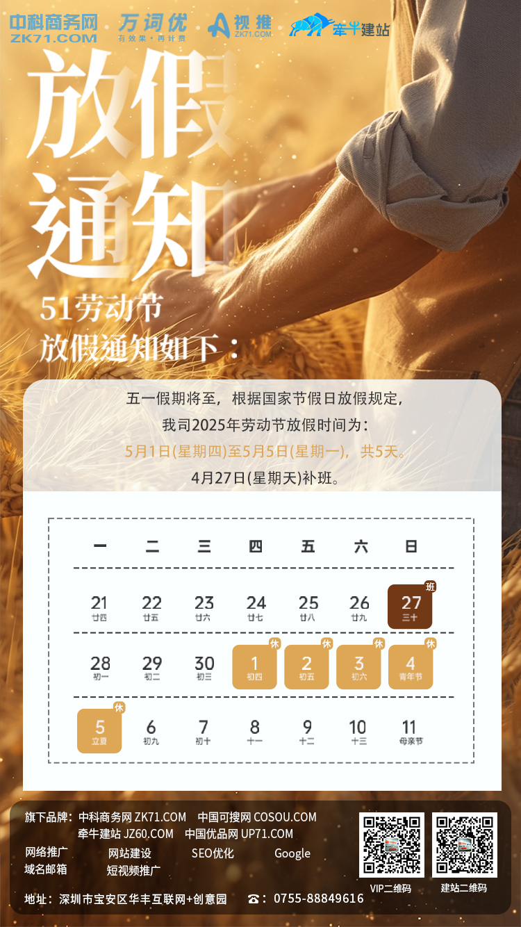 親愛的客戶朋友,五一勞動節假期臨近,我司作如下放假安排: